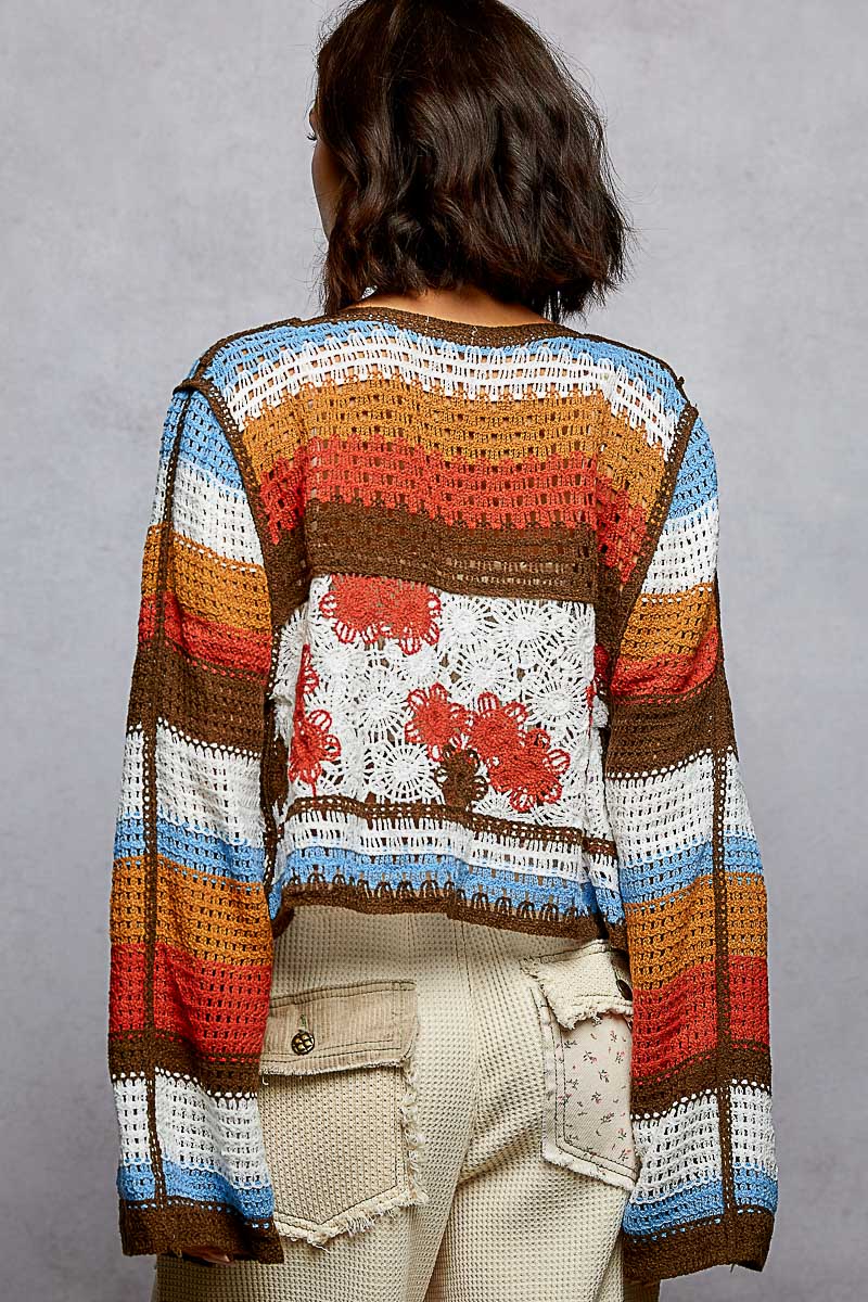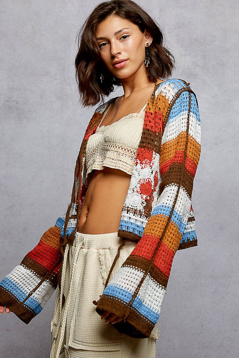 Designed in a soft open-knit crochet, this V-neck long sleeve cardigan brings effortless bohemian charm to any outfit. Featuring a relaxed fit silhouette, multicolor striped detailing, and intricate crochet patternwork, this lightweight layer blends texture and artistry for a true statement piece.