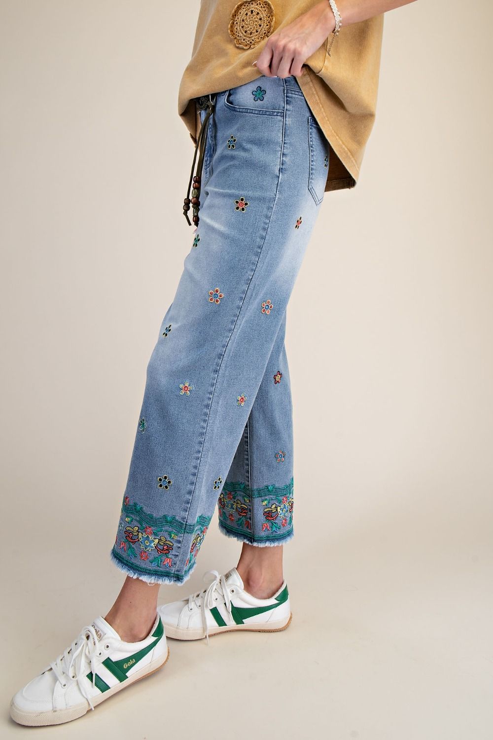 Add a touch of artisanal charm to your everyday denim with these embroidered stretch denim pants. Designed with a relaxed wide-leg, cropped silhouette, this statement pair features delicate multi-colored floral embroidery scattered throughout and a beautifully detailed embroidered hem finished with a raw, frayed edge for an effortlessly bohemian feel.