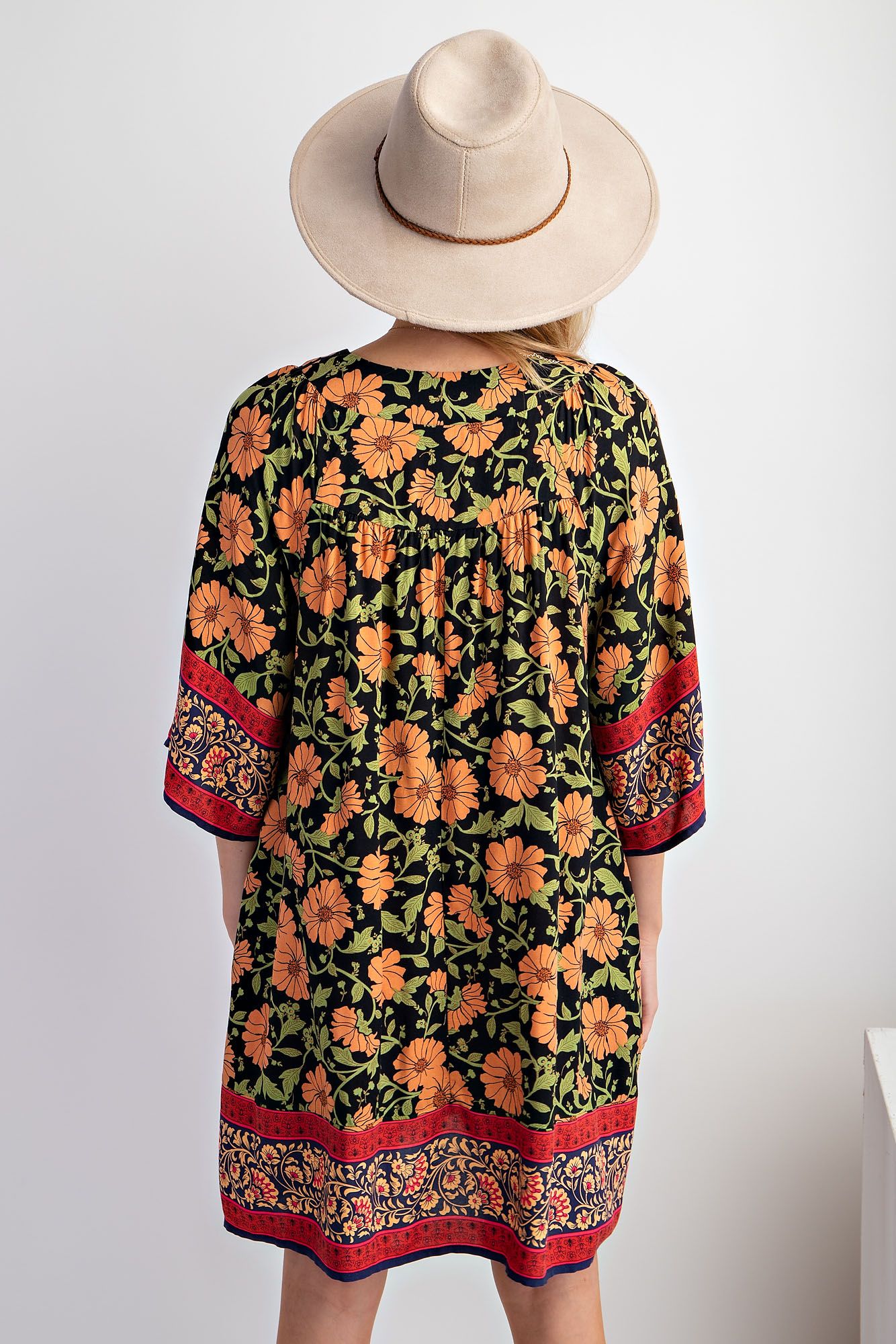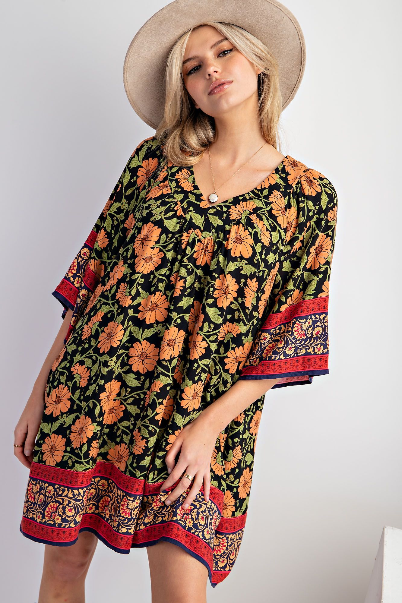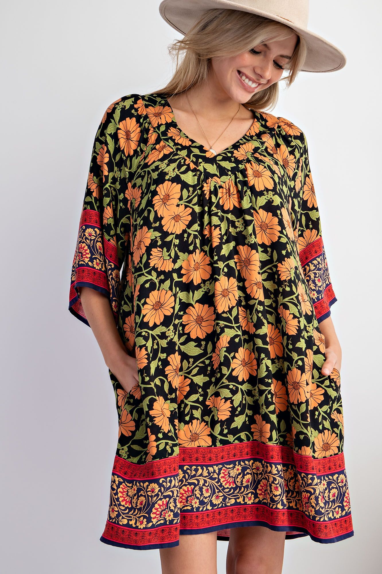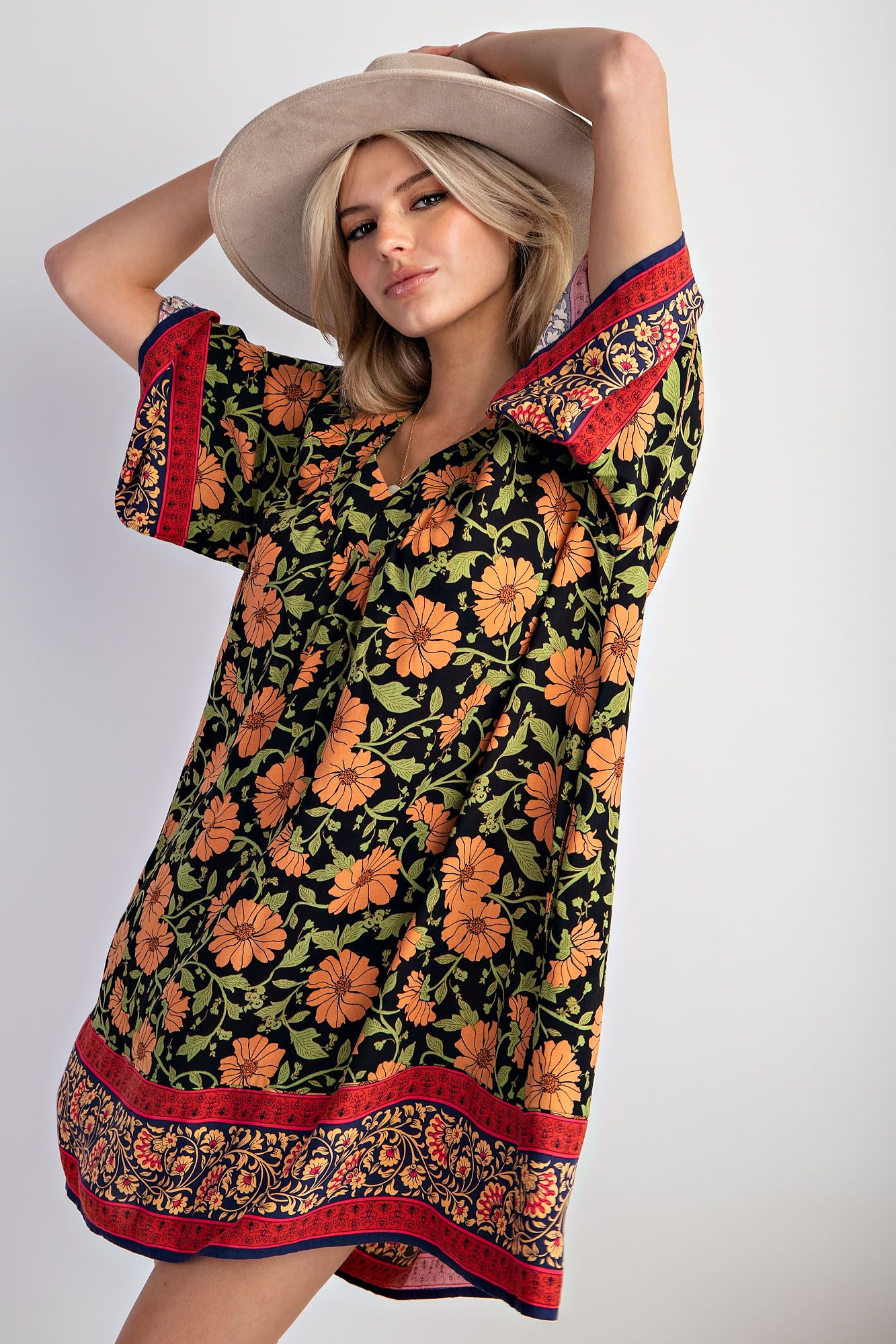 This bohemian floral swing dress is the definition of easy, throw-on-and-go style. Made from soft, breathable rayon, it features a relaxed silhouette that drapes beautifully on the body. The bold floral print is complemented by an eye-catching border hem and patterned sleeve accents, giving it that artisan, globally-inspired feel. With a flattering V-neckline and roomy fit, this dress is perfect for warm days, casual outings, or layering into early fall.