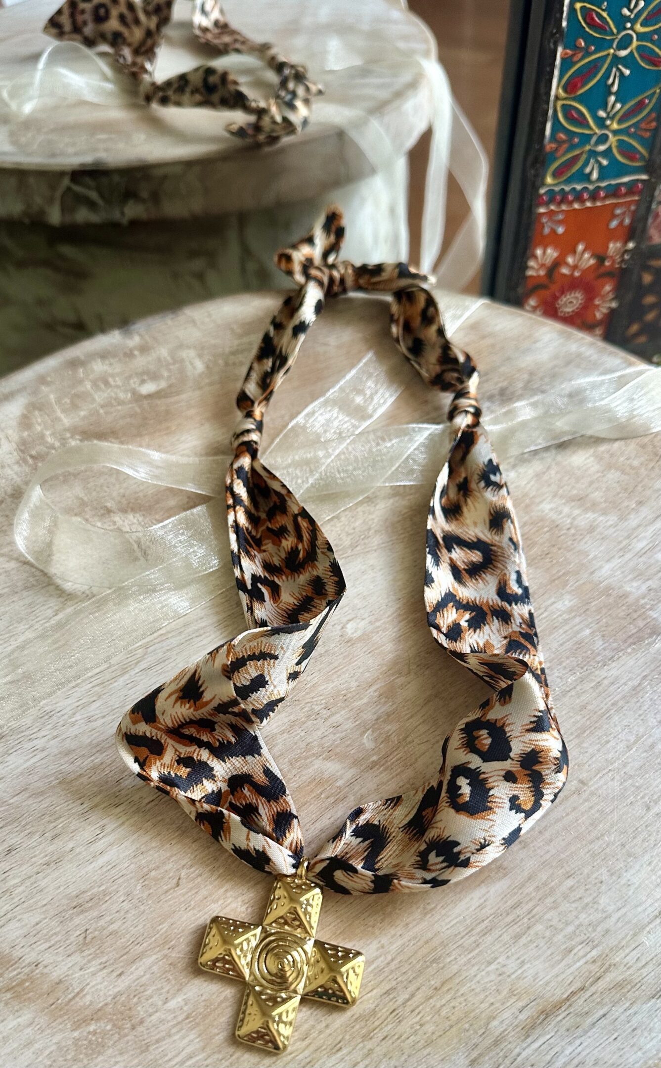 Leopard Print Silk Scarf Necklace with Gold Cross Pendant