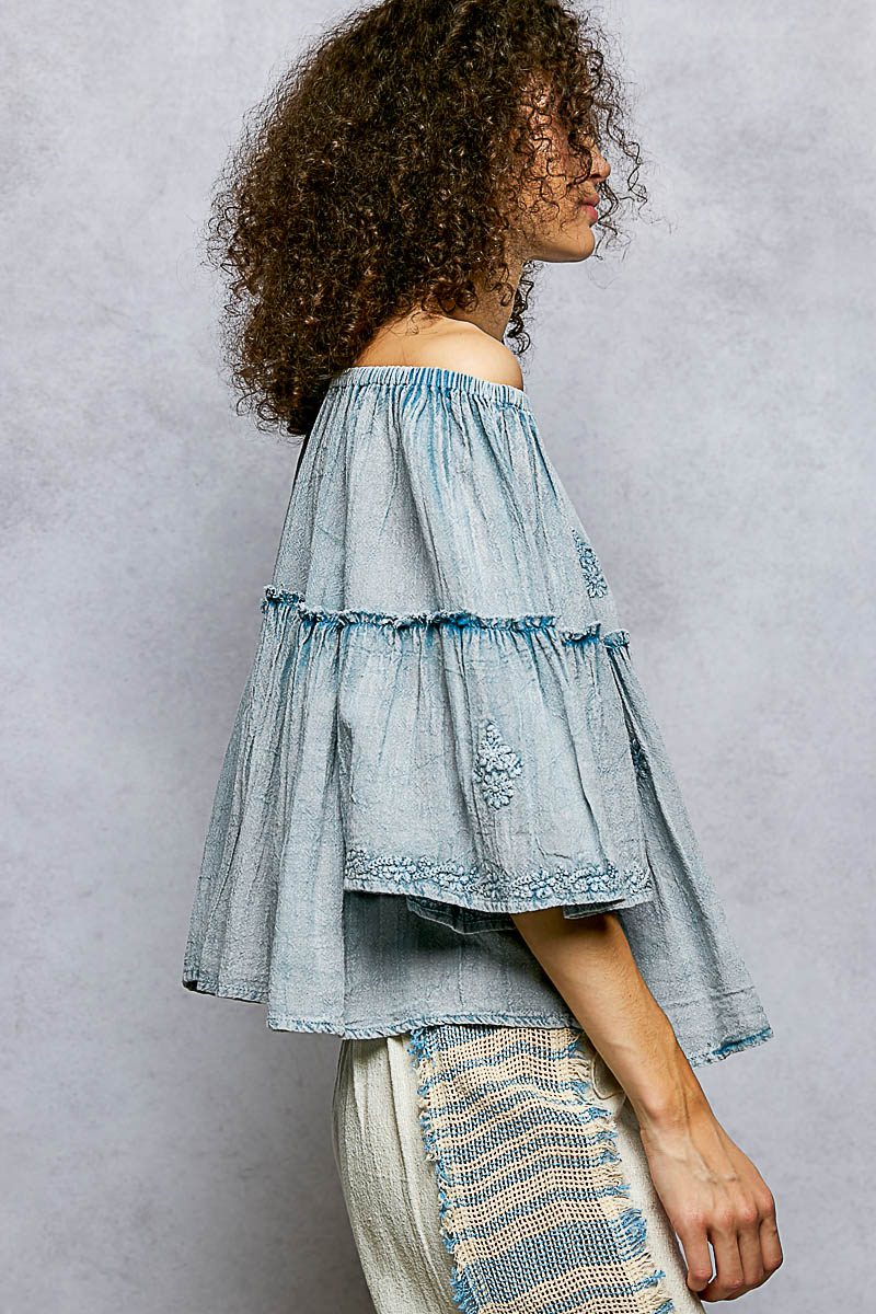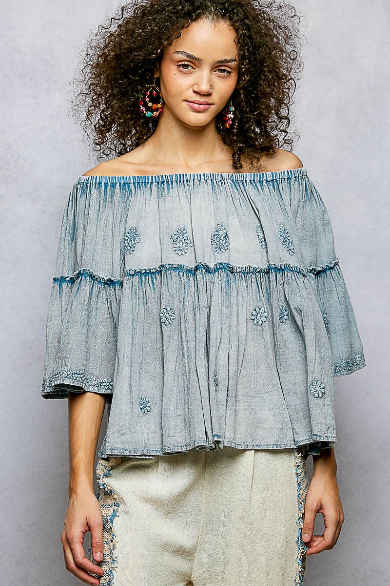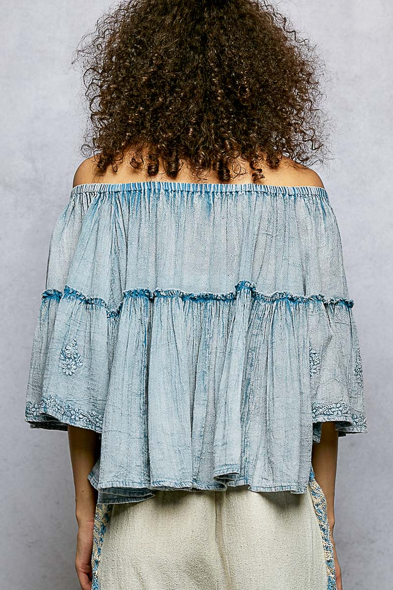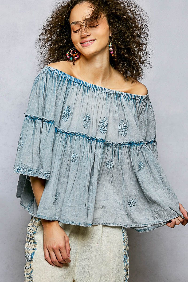 Soft, sweet, and effortlessly bohemian—this top crafted from soft cotton features bell sleeves, relaxed easy silhouette, embroidered floral details, a billowy tiered silhouette, and an easy off-shoulder neckline. Lightweight and full of movement, it pairs beautifully with jeans, linen pants, or skirts for a relaxed boho look.  Ruffle accents and vintage washing enhance its soft texture and give the piece a naturally worn-in charm.