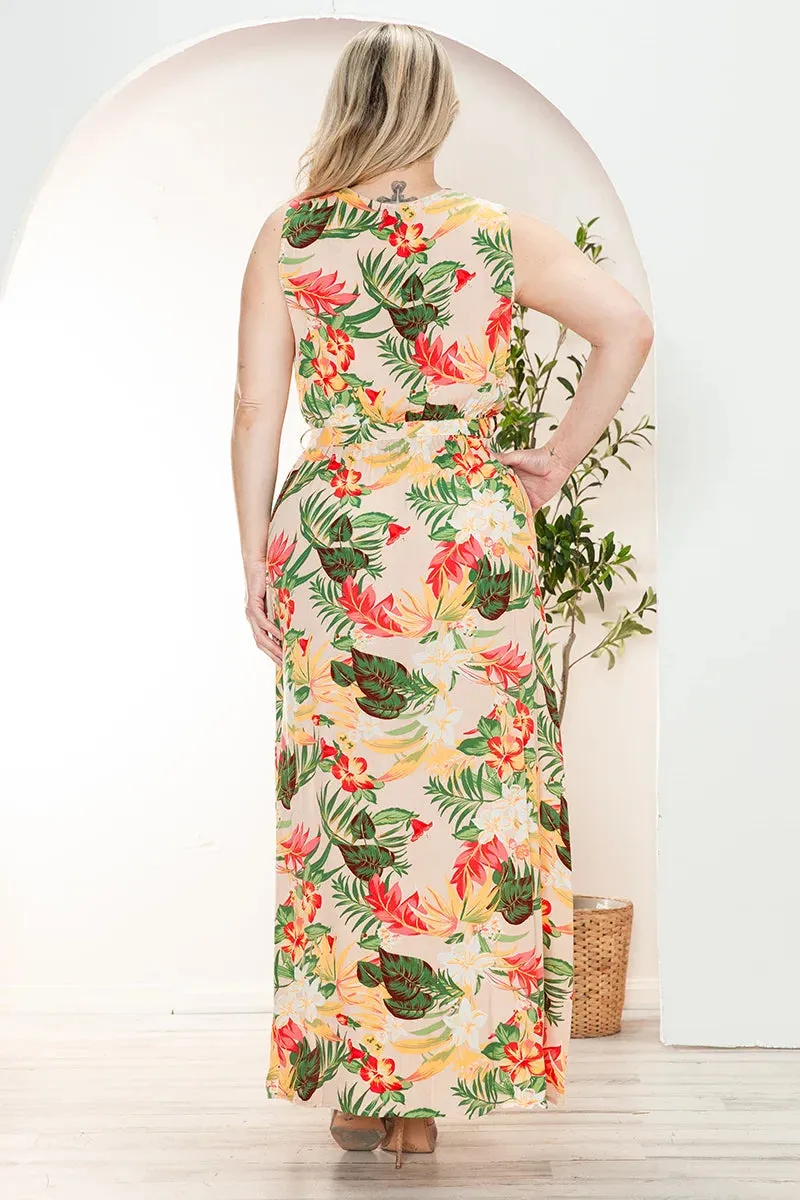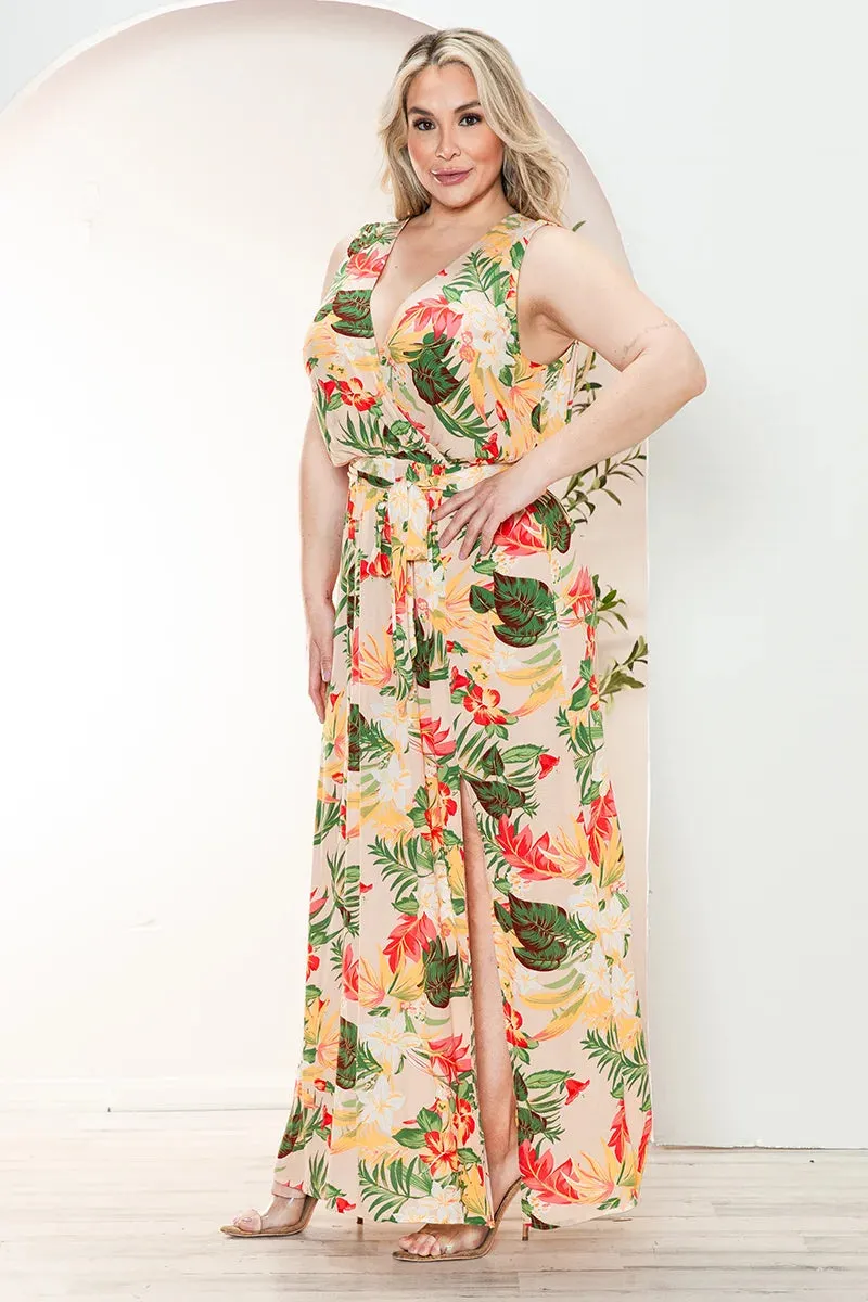 Curvy Size Boho Floral Wrap Belted Front Slit Maxi Dress