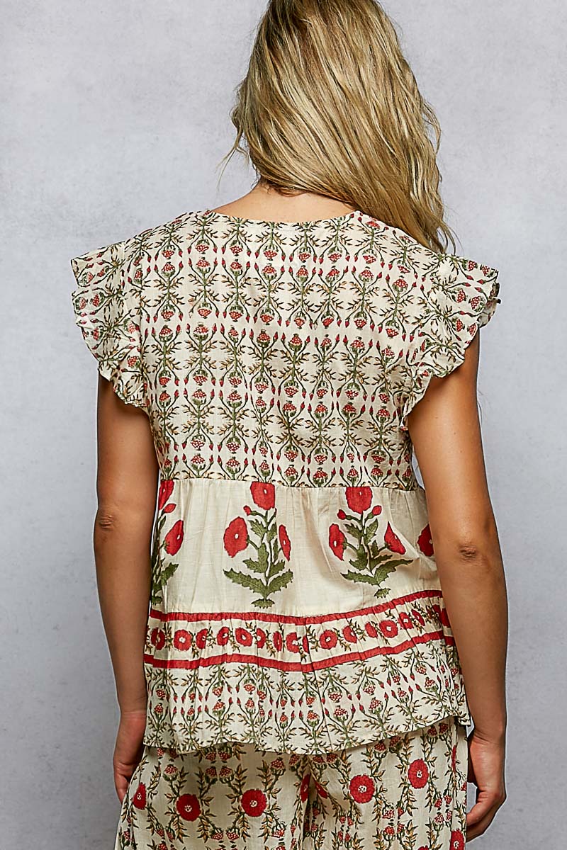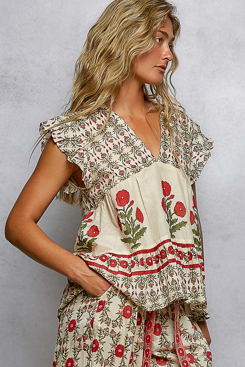 This POL Garden Meadow Top blooms with charm—featuring flutter sleeves, a relaxed fit, and beautiful floral hand block-print patterns. This item is crafted using traditional hand block printing, a fully manual process that may show slight variations in color, alignment, and texture. These natural differences are not flaws, but a beautiful reflection of the artisanal process, making each piece truly unique and one of a kind.Lightweight, breathable, and easy to wear with denim, shorts, or linen pants for an instant boho upgrade.