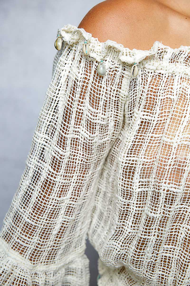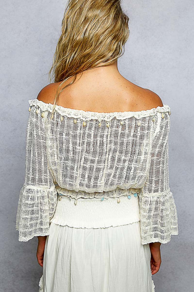 Float into spring with this dreamy POL off-shoulder textured blouse, designed in a soft ivory woven gauze that feels light, airy, and effortlessly bohemian. The ruffled elastic neckline is beautifully accented with delicate seashell and bead embellishments, adding a coastal, hand-touched detail that makes this piece truly special. Textured open-weave fabric, romantic bell sleeves, and soft fringe edging create a feminine, artisanal silhouette perfect for beach days, brunch, festivals, or year-round layering. A must-have for lovers of elevated boho style.