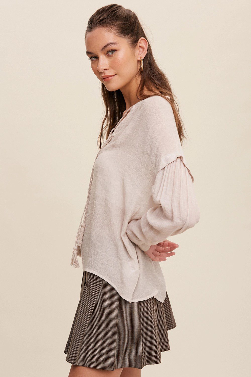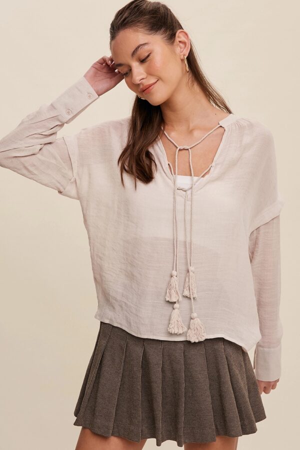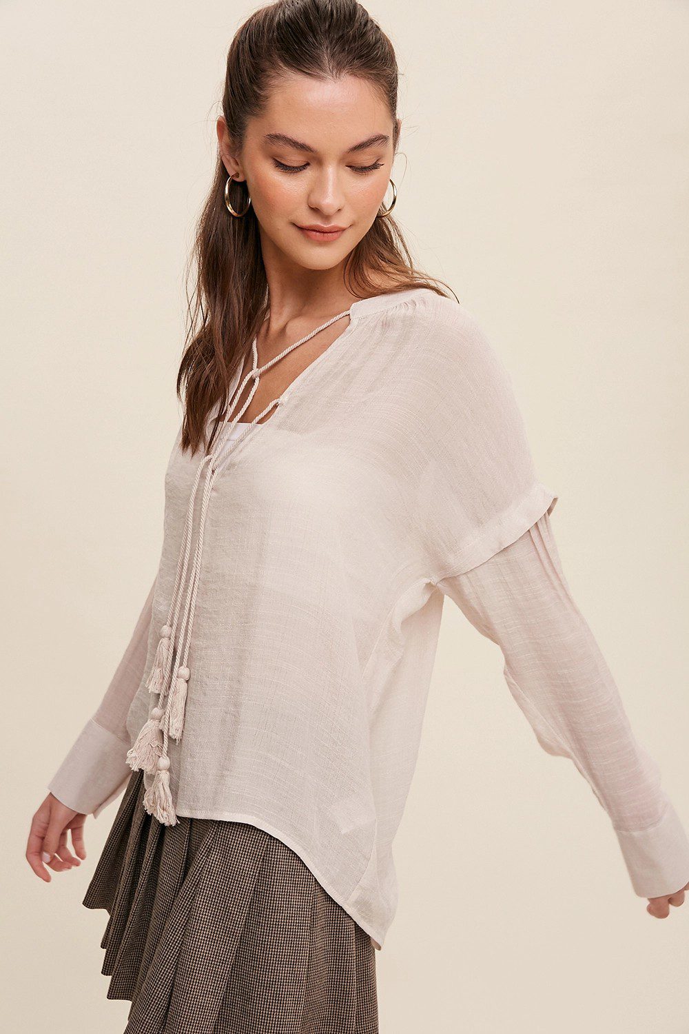 Elevate your everyday essentials with this Listicle neutral peasant blouse featuring tassel tie detail and soft textured fabric. The relaxed silhouette and subtle drape create an effortless coastal-inspired look perfect for layering or wearing solo.