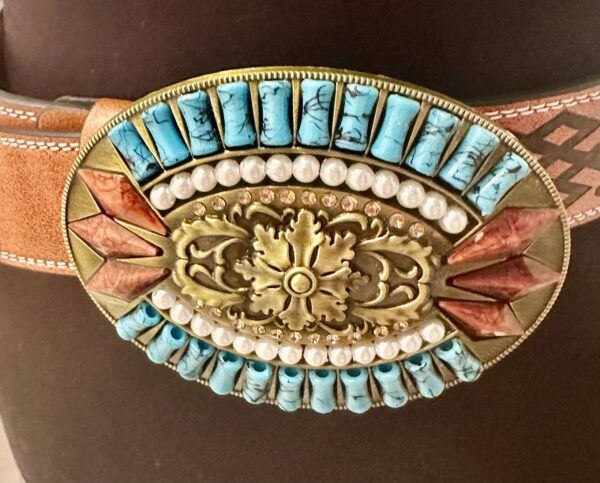 At its center, a stunning oversized buckle steals the spotlight—featuring a floral brass medallion framed by rows of turquoise-inspired stones, shimmering faux pearls, rose-toned gem inlays, and vintage gold detailing. The blend of textures and earthy hues makes this belt a true conversation piece—perfect for elevating denim, dresses, or your favorite festival looks.